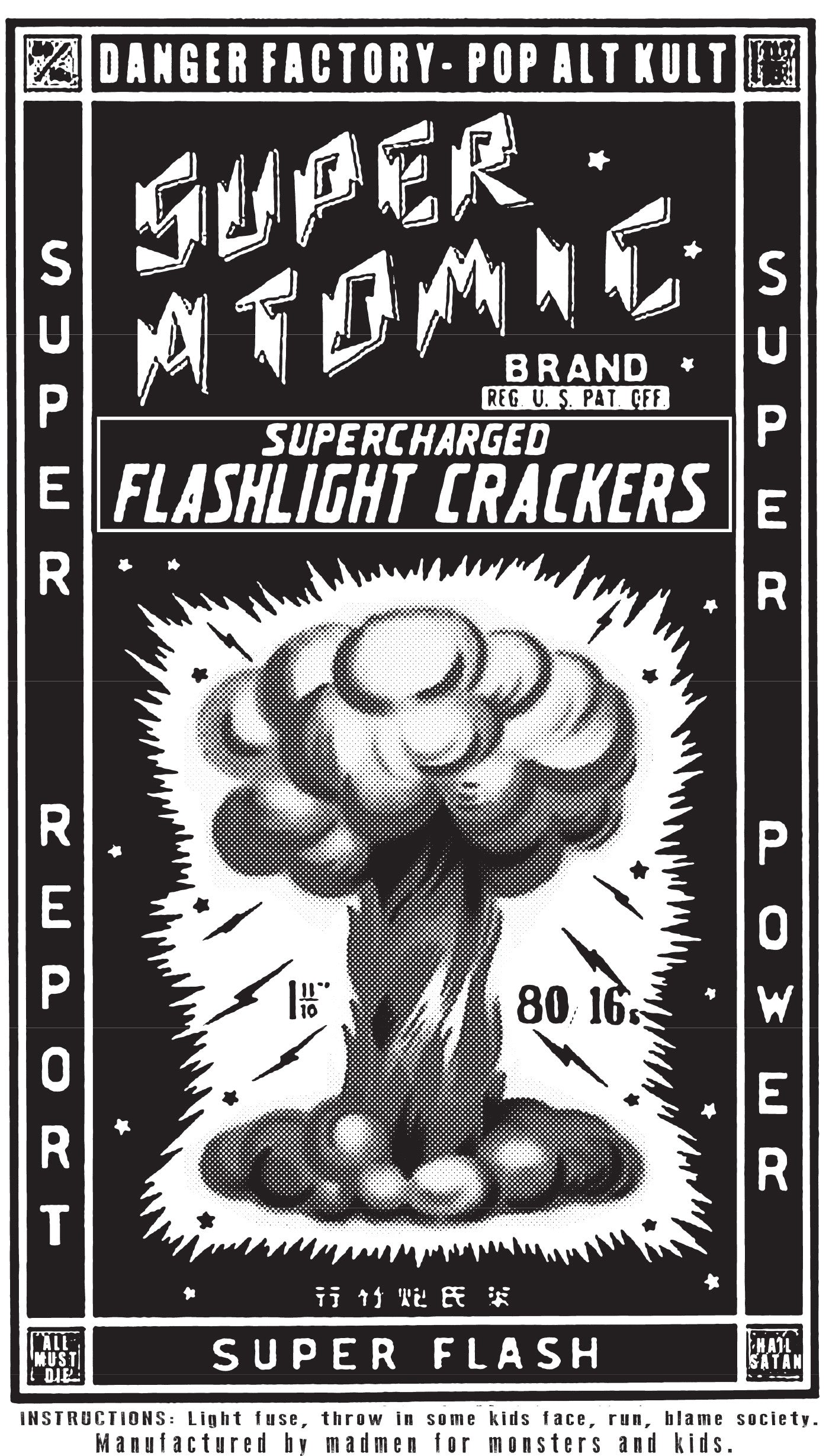 Yes and yes! This one is chock full of them. Even though it is as everyman friendly as a cool-ass design can be, it still has subversive jibes like "Manufactured by madmen for monsters and kids" and sinister instructions like "Light fuse, throw in some kids face, run, blame society." In the course of monkey-wrenching reality to ones surrealist desires, ya just gotta be honest.