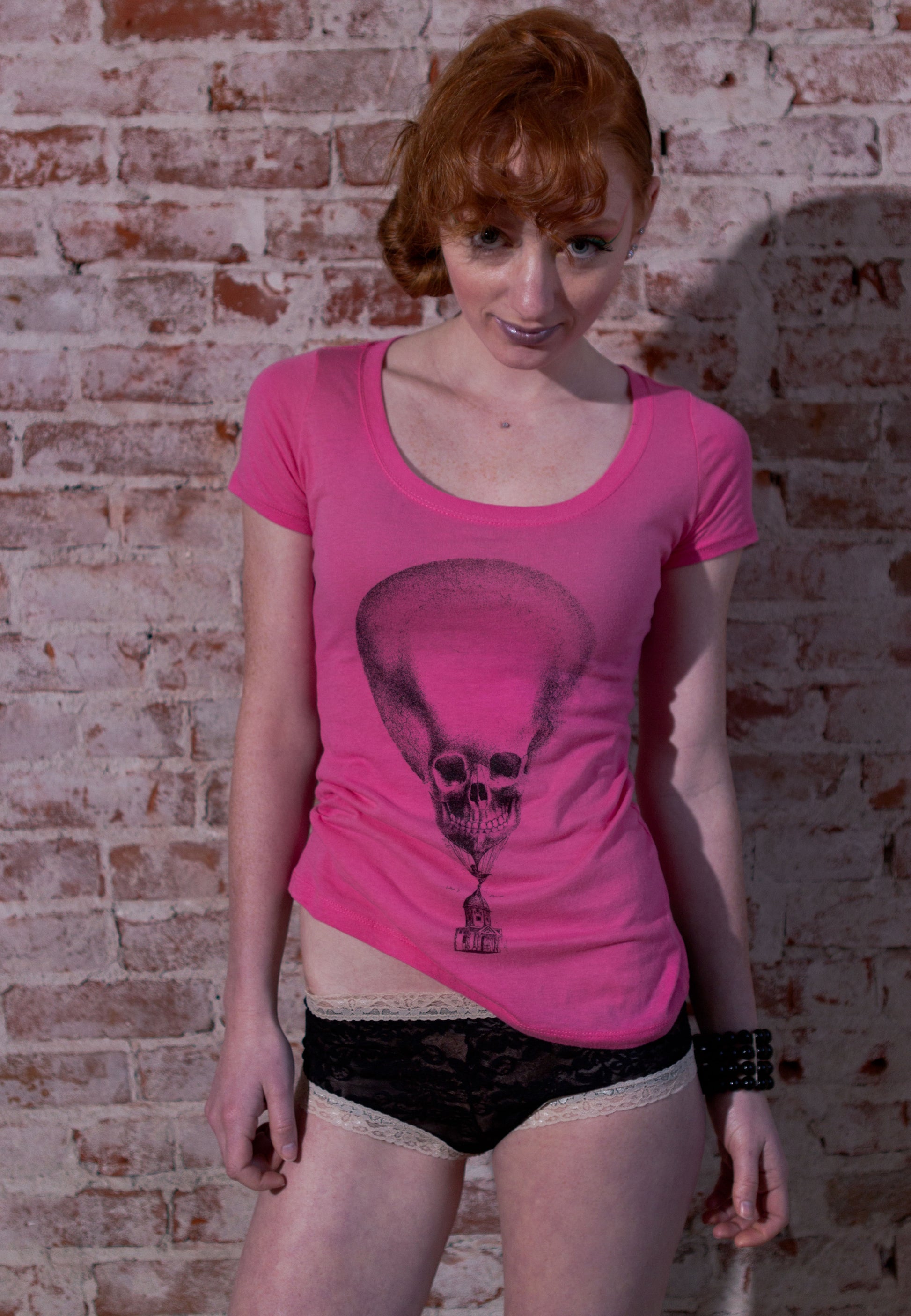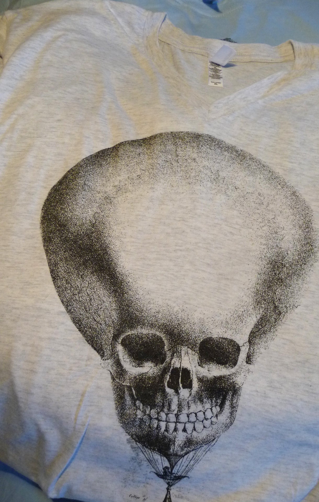 Expand your mind! Then when you die we can attach a house to your big head and travel the known and unknown lands. This is a design whim. I came across a vintage textbook that had various skull malformations and it just HAD to turned into a hot air balloon or a lightbulb. Printed at a slight angle to look aloft. People really compliment this one. As usual, on both guys and ladies blanks. Though the guys is generally considered unisex. Or whatever sex. It's a fan submitted photo- send in yours too!