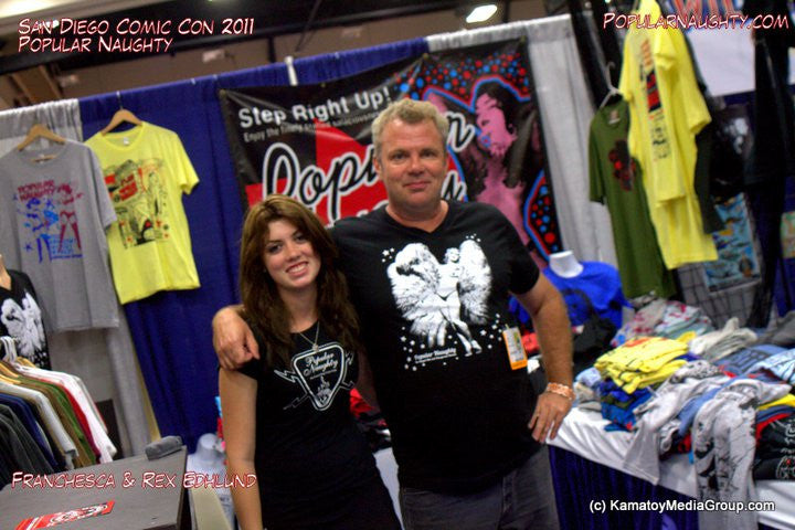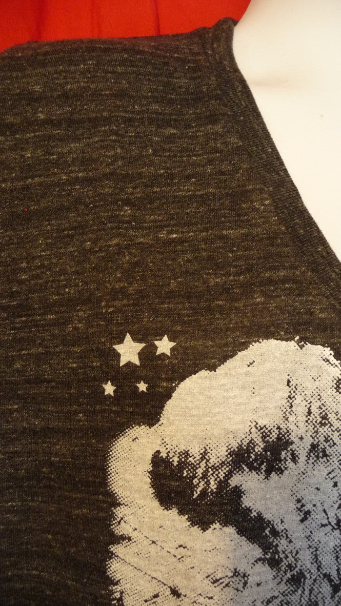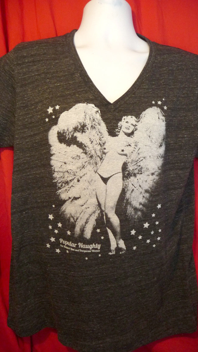 A classic burlesque fan dance by a performer named Faith Bacon. Adopted from a saucy gentleman's publication, we embraced the old printers dots and blew it up for the shirt and finished it with starry decoration. This comes in a V-neck also. The number one seller with visitors from Europe. They seem to be a bit gutsier. I personally wear this one often and do get compliments. I am in one of the pics.