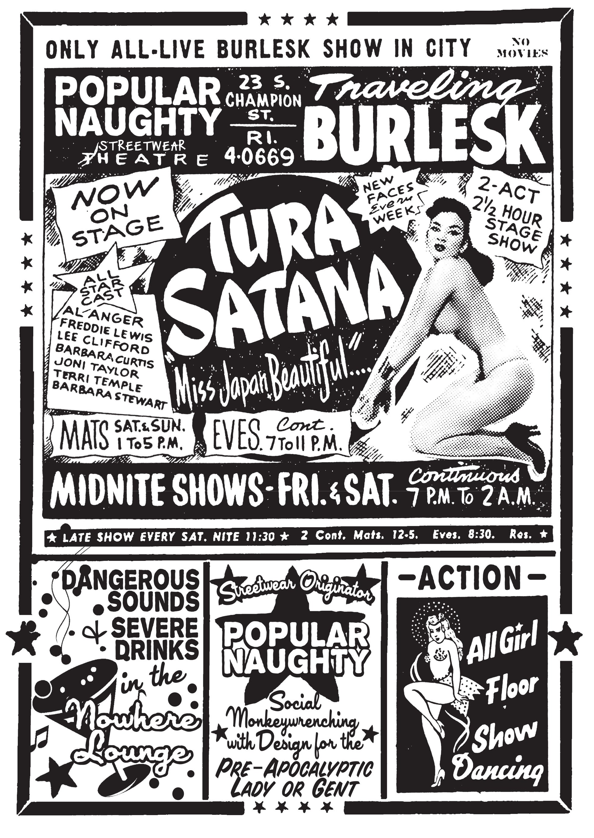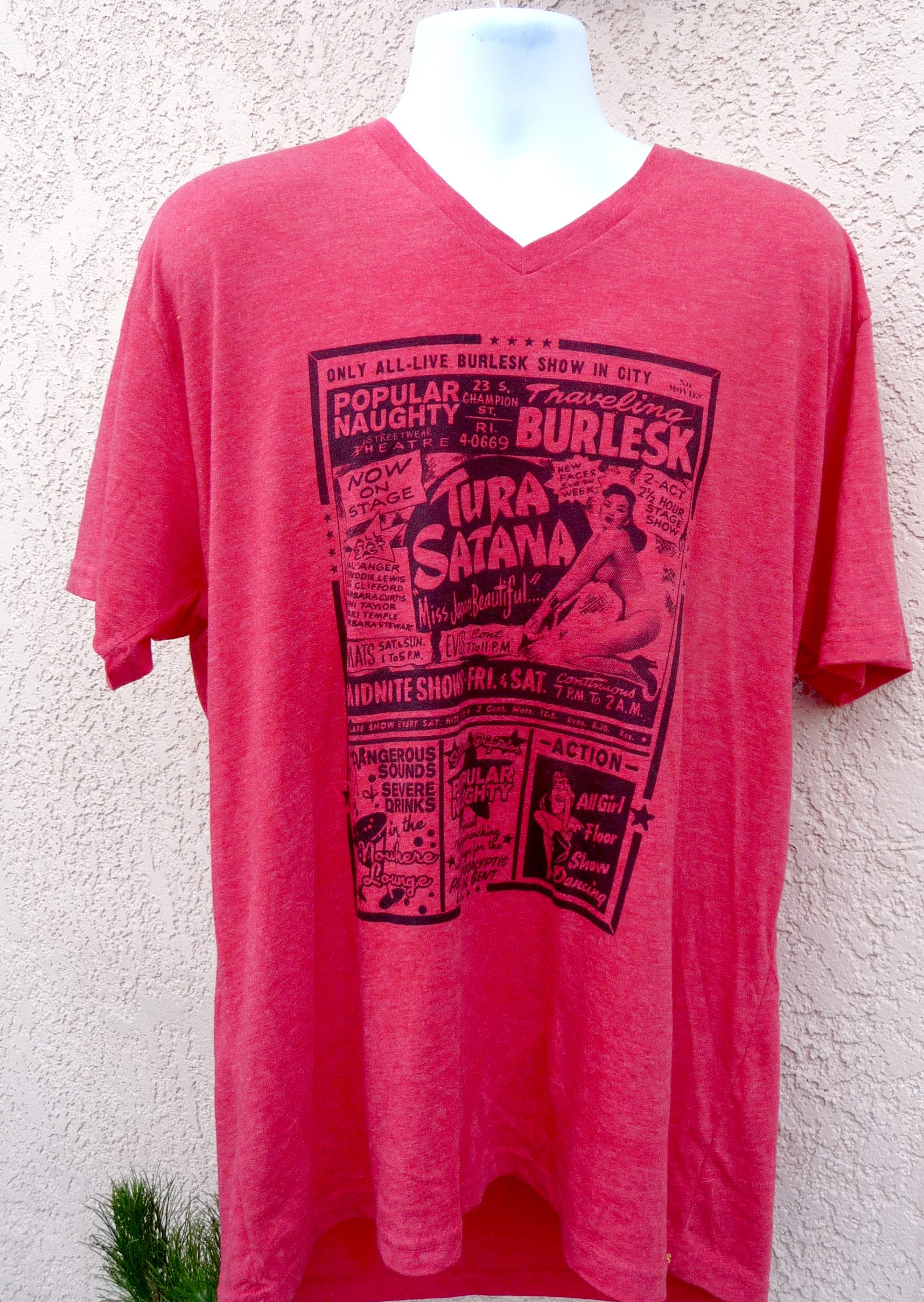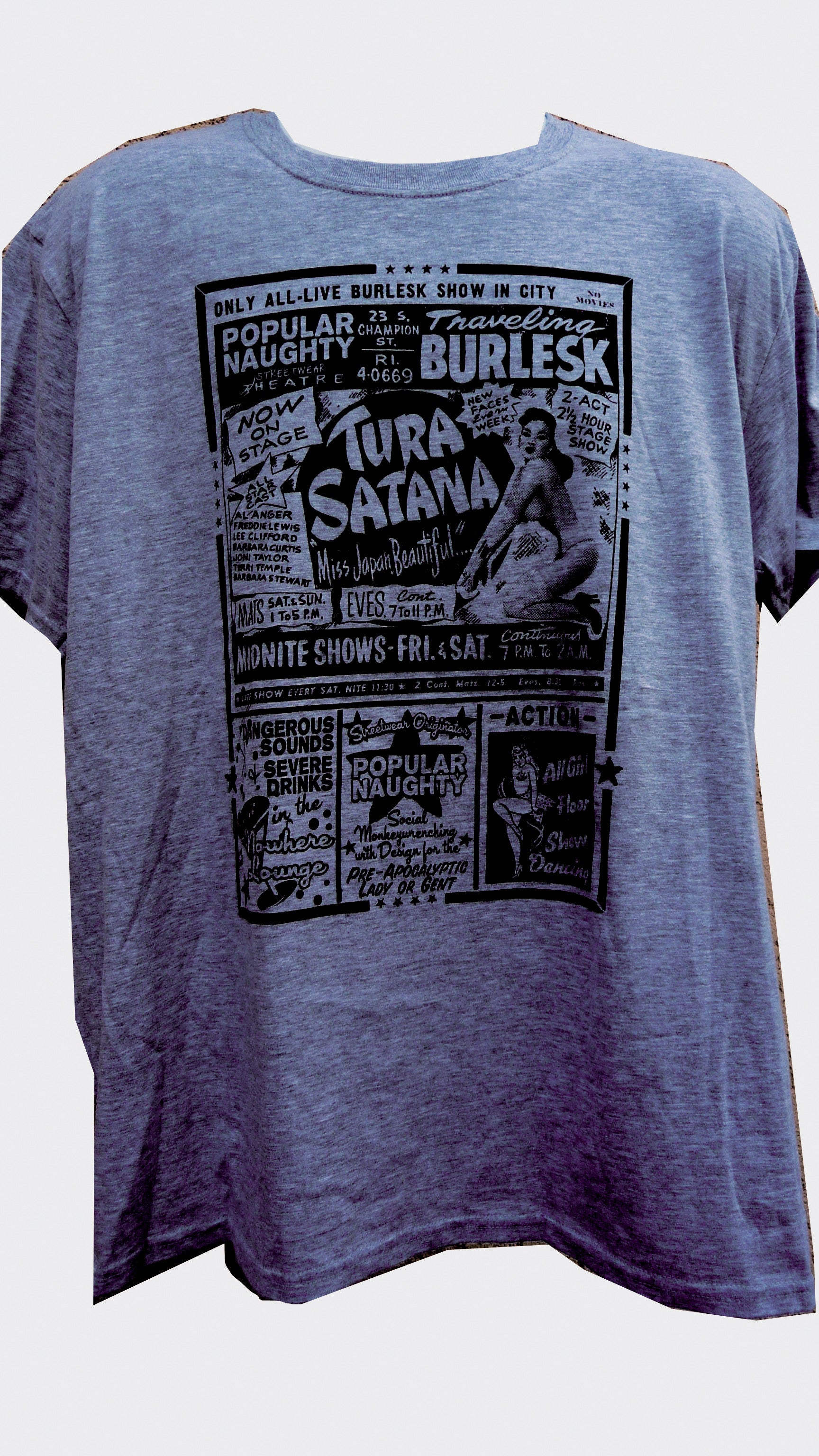 A fantabulous shocker of a shirt in honor of the one and only Tura Satana! I used to see her all of the time at Cons and burlesque events. I even have a picture around here of her and Kitten Natividad honking on my nether regions making every shot look like I am a nerd getting partially electrocuted. The last time I saw here I discussed an official collaboration and told her more about Popular Naughty and Danger Factory, how it's really about the design- not much of a money making scheme, and that we only do maybe a hundred of each design. She said, "I love that. Don't worry about it. Just make me look good." That's what I will do. I jumbled together a half dozen bits from old newspaper ads, adding our elements, a publicity still of Tura that I got from Hollywood Book and Poster, scanned it into the spot where a super cruddy pic of her (same pose) had been and WHAMMO! Totally frickin' hot shirt.